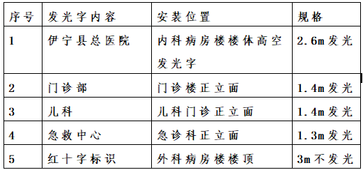 项目名称:伊宁县总医院(县人民医院院区)门诊部及住院部发光字设计及安装采购